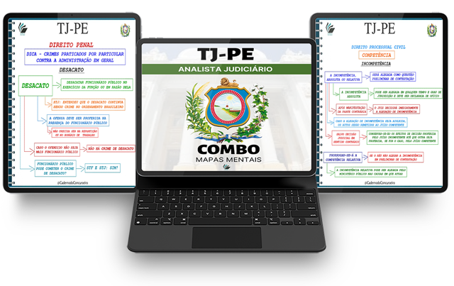 O Combo TJPE é um material em PDF - 100% atualizado em forma de MAPAS MENTAIS ESPECÍFICOS (1.300 mapas) para o concurso do Tribunal de Justiça de Pernambuco, elaborado com base no estudo estatístico das questões da banca IBFC.