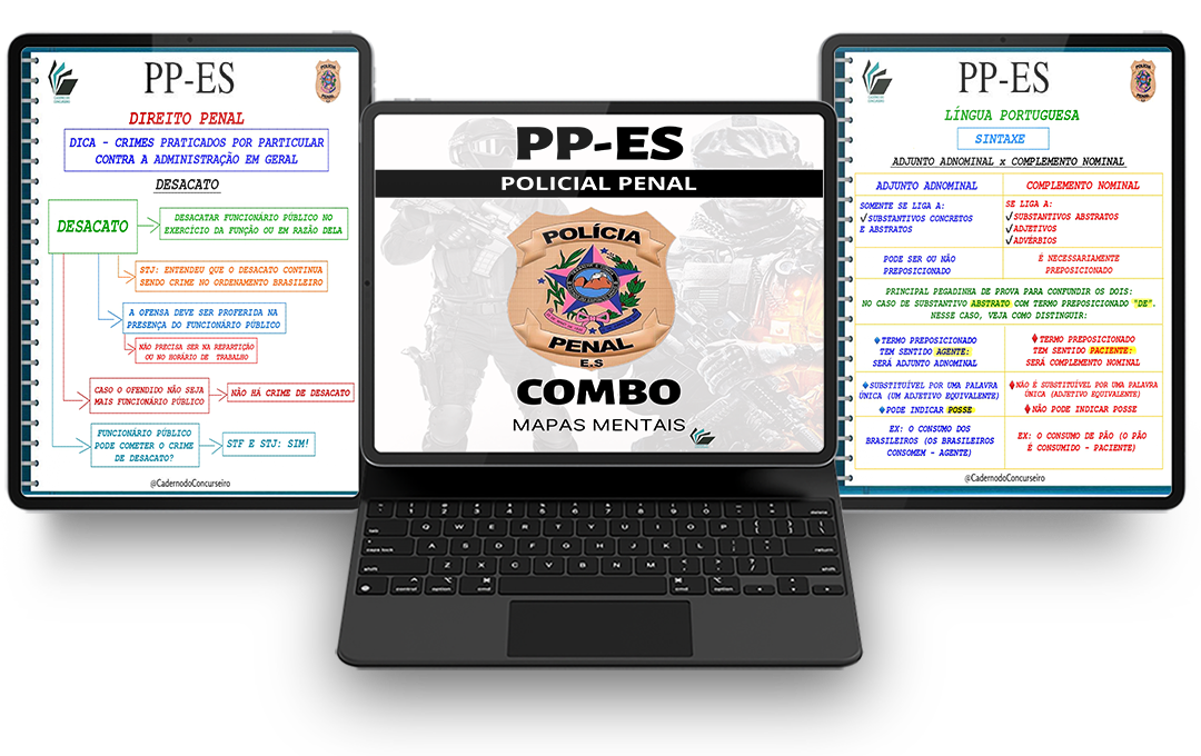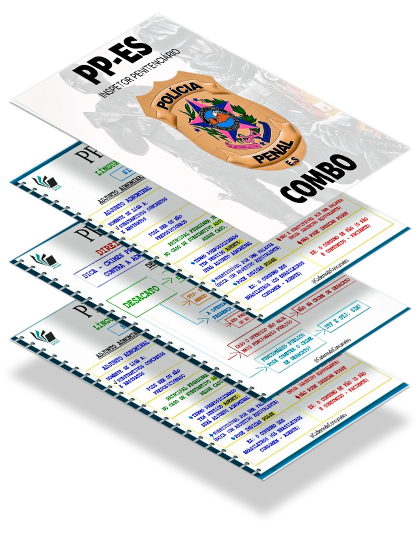 O Combo PPES é um material em PDF - 100% atualizado em forma de MAPAS MENTAIS ESPECÍFICOS para o concurso da Polícia Penal do Estado do Espirito Santo, elaborado com base no estudo estatístico das questões da banca IDCAP.